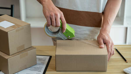 Online shopping concept the shop seller sealing the parcel of his goods on the desk.