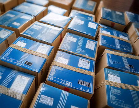Close-up of labeled packages ready for dispatch in a systematic logistics operation