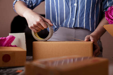 Hand of woman packing box with transparency tape. Ready for shipping to customer.