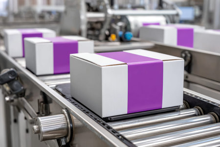 Rows of packages sit on a conveyor belt in a busy warehouse. With purple straps securing the boxes, they are prepared for efficient shipment and delivery.