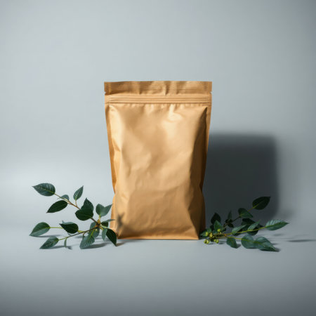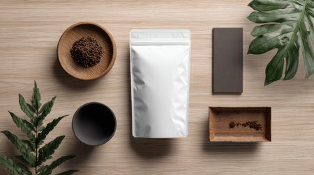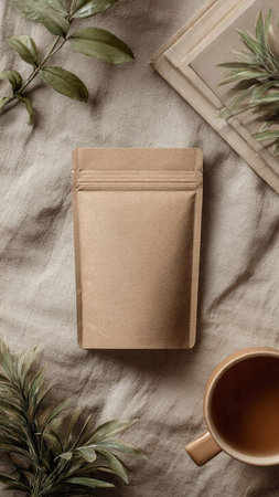 Kraft paper pouch mockup with green leaves. Perfect for eco-friendly product packaging design.