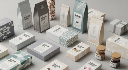 This image showcases a range of eco-friendly packaging designs featuring warm colors and natural textures, ideal for sustainable product branding.