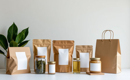 A collection of eco-friendly packaging materials, including paper bags, glass jars, and a plant, on a white background.