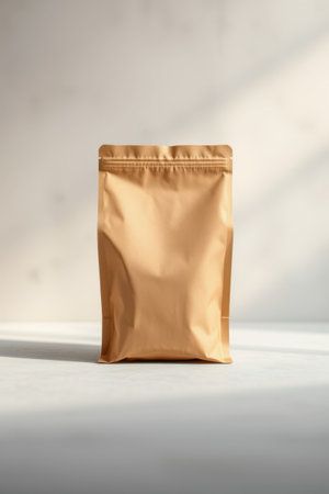 Brown stand-up pouch on a light gray surface. Perfect for product packaging mockups or branding designs.