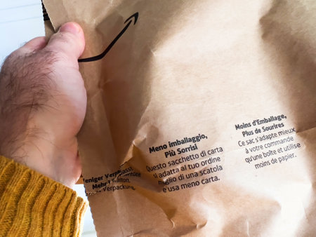 Paris, France - Feb 21, 2018: Amazon.co.uk cardboard open package on the wooden parquet floor