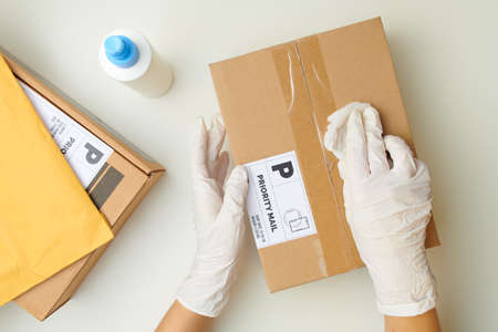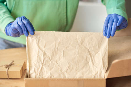 Close-up of person in protective gloves packing things into the cardboard box before delivering