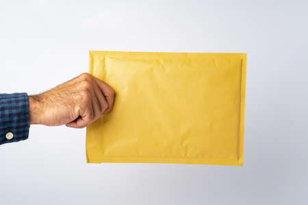 Male hand holding parcel post against white background