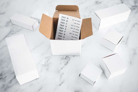 business inventory with every item being low stock or out of stock with postage parcel from online shopping, supply chain shortages and delays after the covid-19 global pandemic