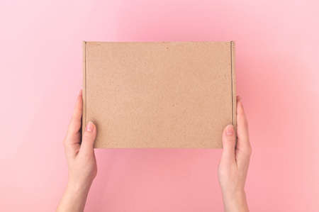Mockup parcel cardboard box in a delivery woman man hands on a pink pastel background, table, delivery service concept photo