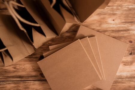 Mock-up of brown craft paper package with handles and boxes, empty shopping bag with area , wooden background. The concept of advertising on the craft package, sales, food delivery