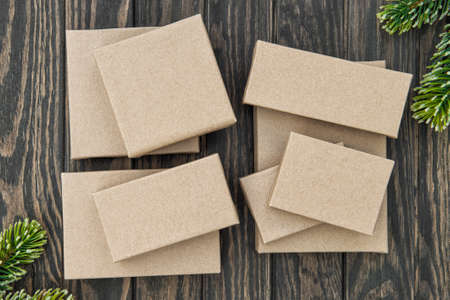 Christmas gift boxes craft paper zero waste wrapping on rustic wooden background