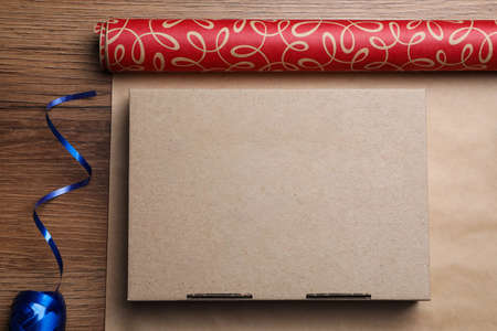 Roll of wrapping paper, gift box and ribbon on wooden table, flat lay