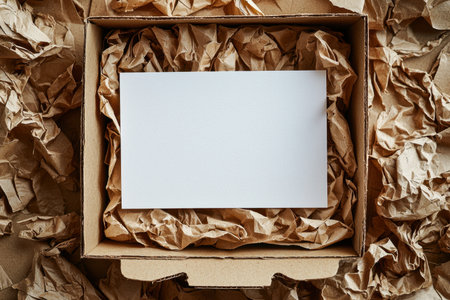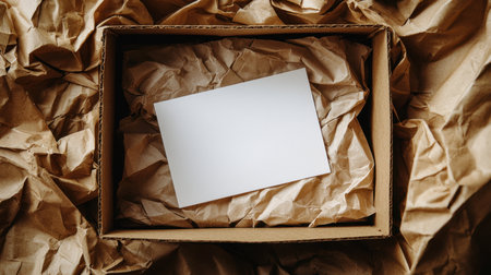 A blank white card rests within a corrugated box, amid crumpled packing paper, evoking themes of shipping, gift presentation, or unboxing surprises.
