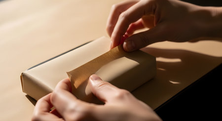 Close-up of hands carefully wrapping a rectangular box using plain brown craft paper. The scene emphasizes sustainable packaging handmade crafts and the preparation of a gift or shipment.