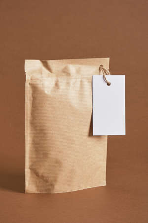 zip craft packaging with white blank mockup tag on brown background, eco-friendly packaging, CO2 neutral, recyclable materials