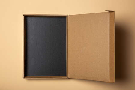 open Cardboard craft box with cover on white background top view. The concept of delivery, mail, destinations, the quarantine period is relevant. Copy space.