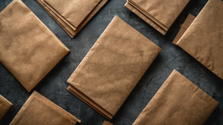 A collection of brown kraft paper packages arranged on a dark background, showcasing a minimalistic and natural aesthetic ideal for packaging and shipping applications.