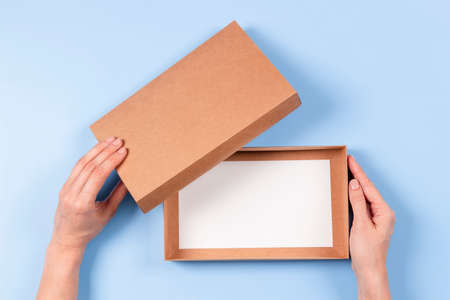 Top view to female hands open empty brown cardboard box on light blue background. Mockup parcel box. Packaging, shopping, delivery concept