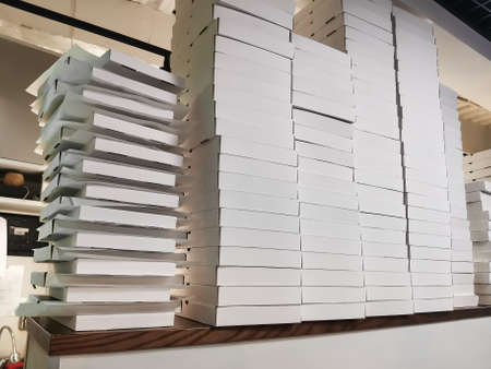 Prepared for delivery cardboard white pizza boxes stacked on a pizza counter. Food delivery, restaurant customer service during a pandemic.