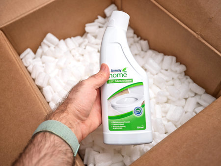 London, UK - Oct 10, 2020: A hand reaches into a box filled with packing peanuts to retrieve an Amway toilet bowl cleaner bottle, symbolizing home cleaning supplies.