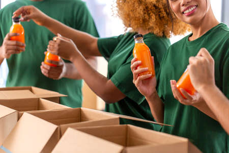 close up of volunteers packing food in boxes