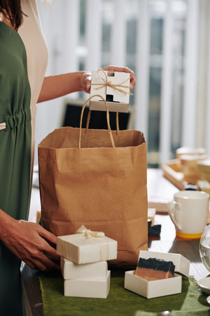 Woman putting packed handmade soap bars into paper bag for her client
