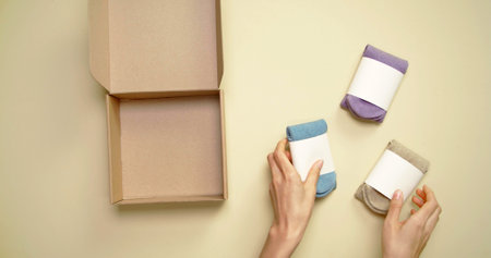 top view female hands wrapping gifts in textile and paper, eco friendly gift boxes wrapping