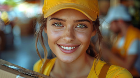 A construction worker is shown smiling broadly while wearing a yellow hard hat and orange safety vest. The image features a bright, natural-light composition with a neutral background. This image could be used for various commercial projects related to construction, safety, or workforce themes.