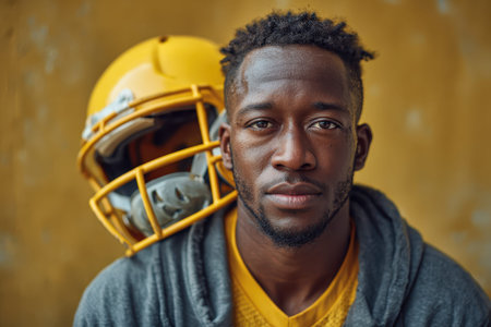 University student in yellow sports gear poses confidently with a football helmet on shoulder in a sunny outdoor setting during the afternoon