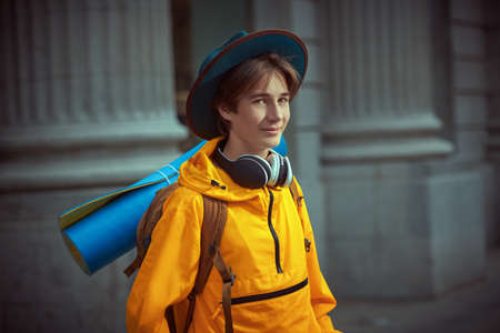 Children's and teenage tourism, holidays. Portrait of a modern teenage boy who travels on vacation with a backpack on his back. Active lifestyle.