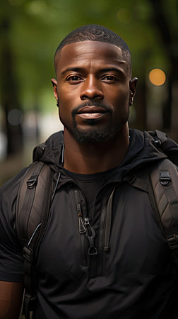 Fit sporty young African man wearing black sportswear relaxing after workout in urban park on summer day. Strong muscular guy bodybuilder sweating. Man face portrait illustration. Generative AI art