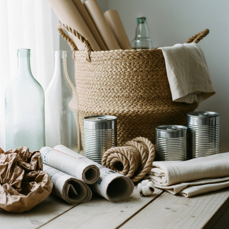 Various recycled and upcycled items are neatly organized on a table, showcasing materials for creative art projects focused on sustainability.