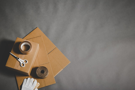 Stack of cardboard box on floor laminate background. Empty box case top view. Moving or relocation concept