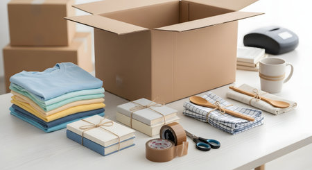 A wooden table is organized with a cardboard box, folded clothes, books, kitchen linens, and packing supplies like tape and scissors. This setup represents the process of decluttering, packing for a move, or preparing a care package.