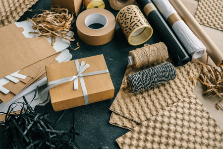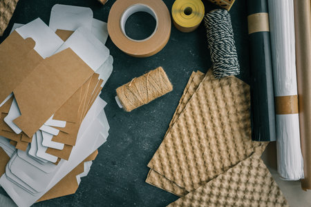 Decorative paper, various strings and ropes for wrapping presents on table of creative person