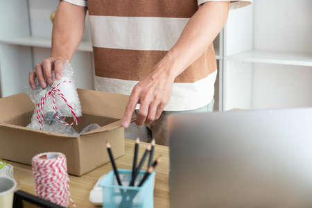 Online shopping concept the shop dealer wrapping his product and putting it into the package.