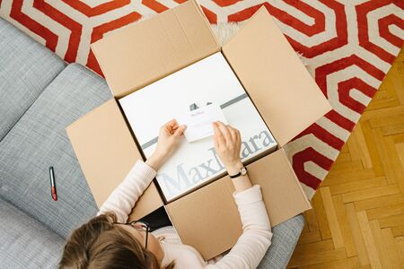 Paris, France - Dec 1, 2017: Overhead view of elegant woman opening new e-shopping cardboard box with luxury Max Mara logotype and tow - reading greeting card