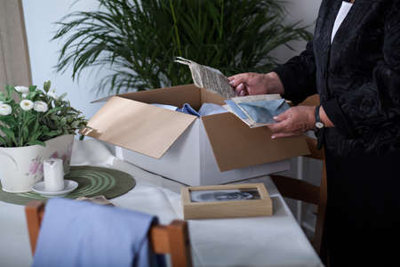 Female hands stack Retro objects in a cardboard box on a wooden floor. Antiques, vintage. Top view