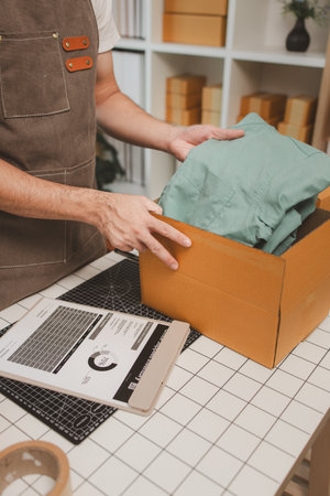 Packing online order to delivery to customer. Preparing parcel box with clothes product from online shop