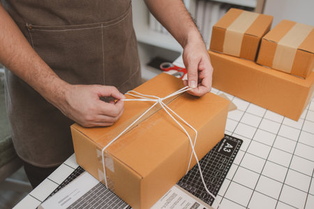 Online shopping concepts with male hand packing some product to brown box on another packet for shipping to customer.Ecommerce,delivery and logistic network.Business retail market