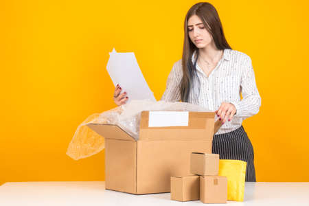 The girl checks the delivered order. A long-haired girl with a list in her hands. Unpacking an order from an online store. The girl next to the boxes on an orange background.