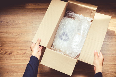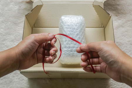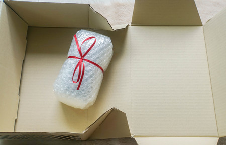 goods wrapped with bubble sheet and red ribbon put into carton package for parcel