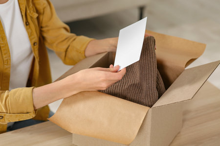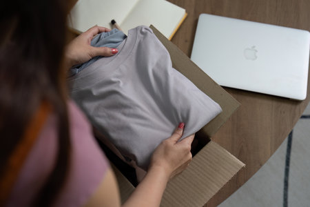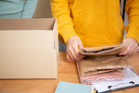 Closeup hand of woman packing in cardboard box for shipping or storage in home office, online seller packing clothes in box for delivery, logistic and cargo, service of retail.
