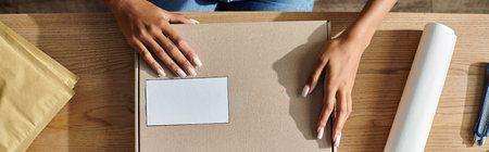 cropped view of hard working african american female merchant with hands on post packet, banner
