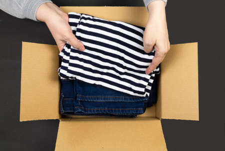 A woman puts clothes in a box - a striped T-shirt and jeans. Concept delivery, packaging