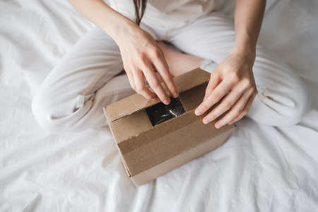 A woman opens a cardboard box, the parcel sitting on the bed at home. Delivery concept.