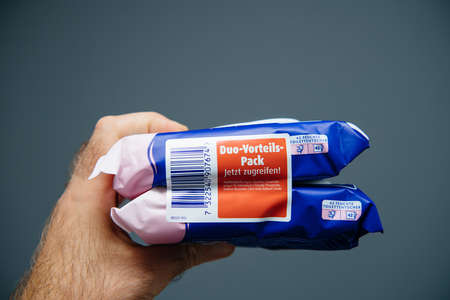 Paris, France - Aug 7, 2019: POV male hands holding fresh toilet wet paper manufactured by Tempo Feuchtes Toilettentucher side view at the duo double special price pack