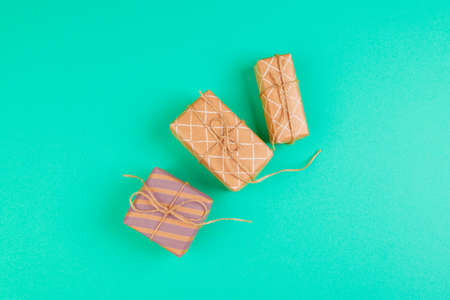 Simple eco friendly gift boxes package wrap with brown paper on vintage wooden table, green present concept, copy space