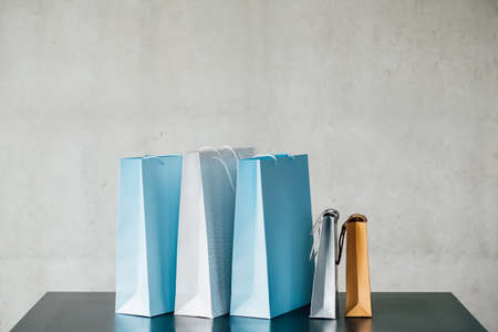 It's shopping time. Urban consumerism. Paper bags row on desk. Copy space on grey background.