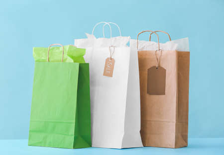 Paper shopping bags on color background